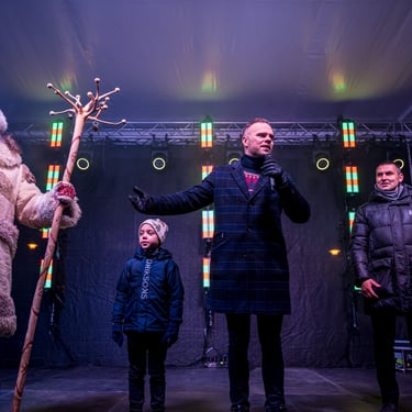 Susirinkusiuosius pasveikino ir šventės prasmingumą pabrėžė Trakų rajono savivaldybės meras Andrius Šatevičius, kuris kartu su Lentvario seniūnijos seniūnu Artūru Nausučiu padėjo įžiebti pagrindinį šventės simbolį – Kalėdų eglę. Jų linkėjimai bendruomenei buvo kupini vilties, kad šventinis laikotarpis atneš daugiau ramybės ir šviesos į kiekvienus namus. Sužibus kalėdinėms lemputės, aikštė akimirksniu pavirto tikru šventiniu pasakos kampeliu.